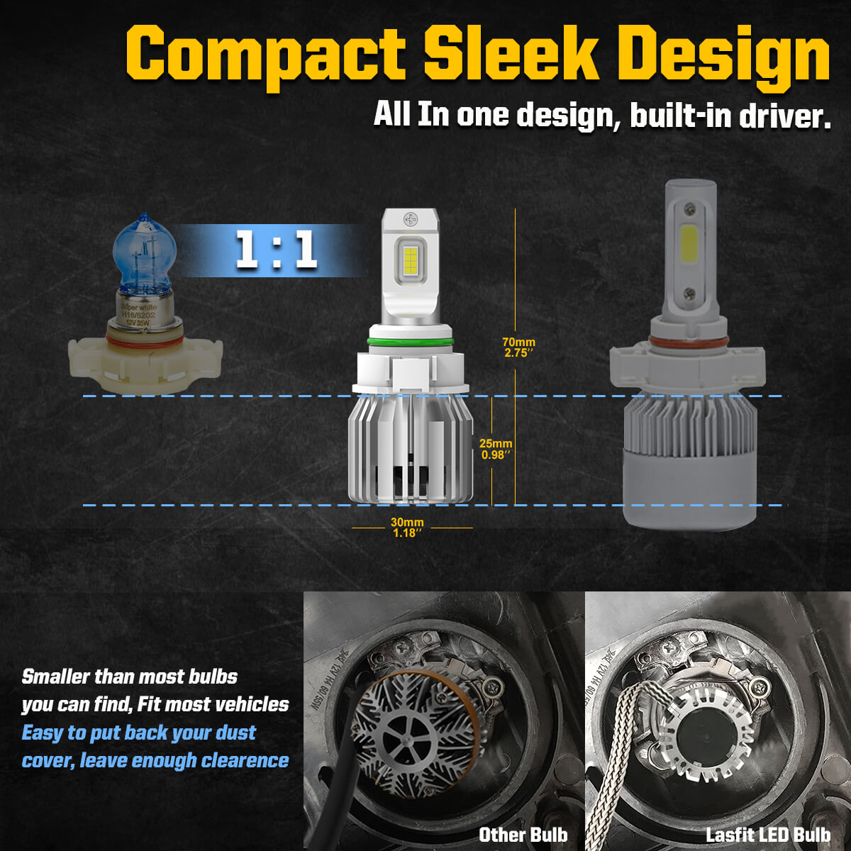 The smallest size of all Lasfit 6 different series LED bulbs to fit over 95% of vehicles without modifying the OEM dust cap. The bulbs are also designed as small as they can to fit the assembly with bulb holes off the center. LC plus series is one of the smallest LED lights on the market, with a built-in driver that can perfectly fit most vehicles without installation issues.