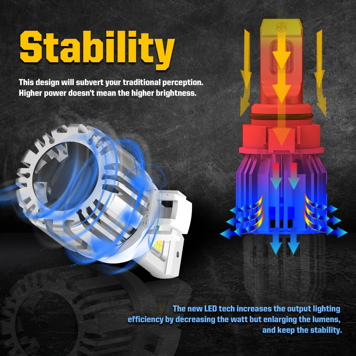 Not only the smallest but also more stable! The led bulb with the all-aviation aluminum body, hydraulic fan, and built-in intelligent IC and temperature control system can perfectly solve the problem of light decay and dead lamp caused by the highest temperature of LED car light to ensures it will last longer.