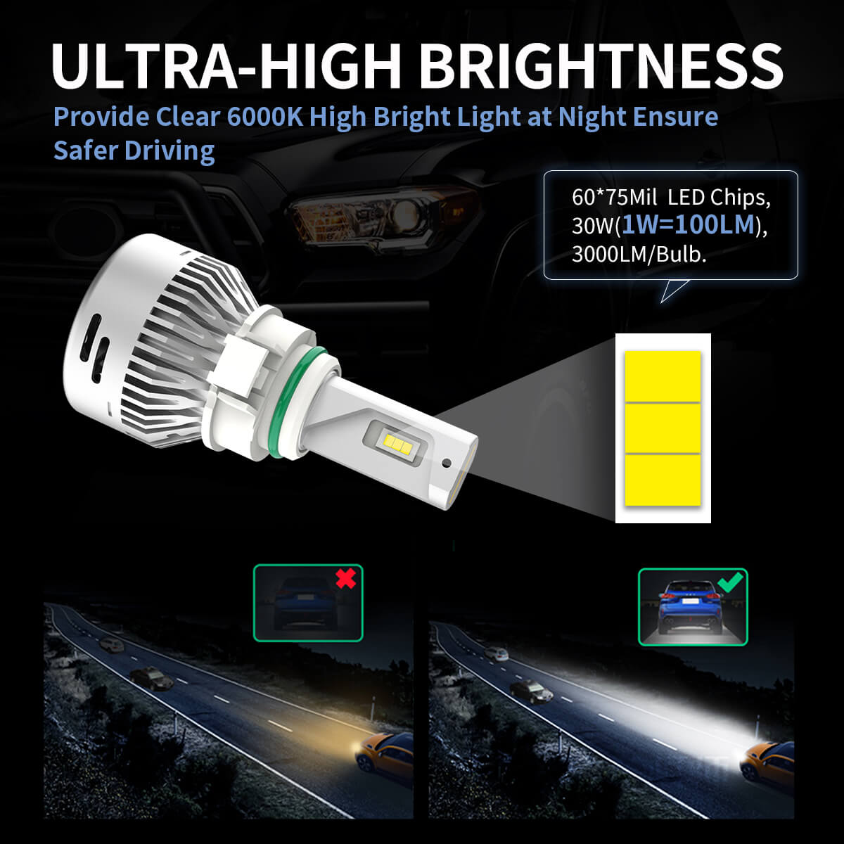 Built with smaller size than the common LEDs in the market without building an external driver, directly plug into the factory housing.