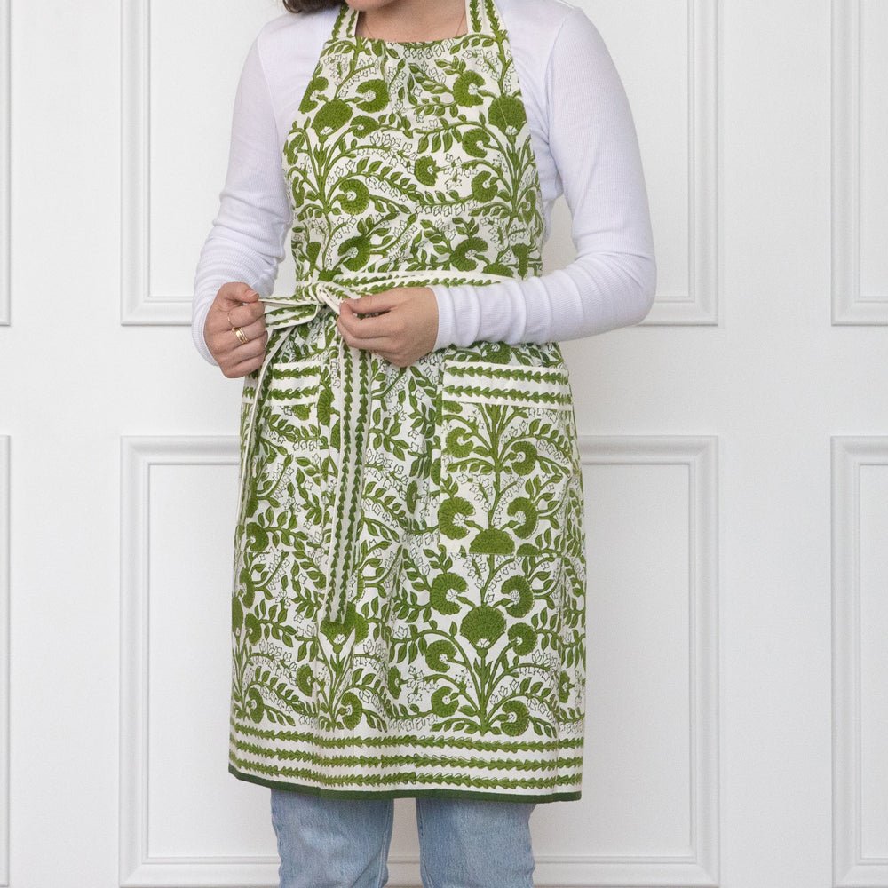 Embrace the art of cooking with the Cactus Flower Lettuce Green Apron. Hand block printed with intricate patterns, this apron features a vibrant green floral design. Made from 100% cotton, it ensures comfort and durability while adding a touch of elegance to your kitchen attire. Perfect for both everyday use and special occasions, this apron is a must-have for any culinary enthusiast.