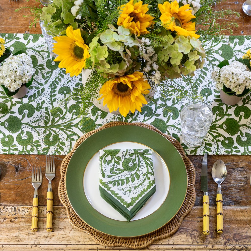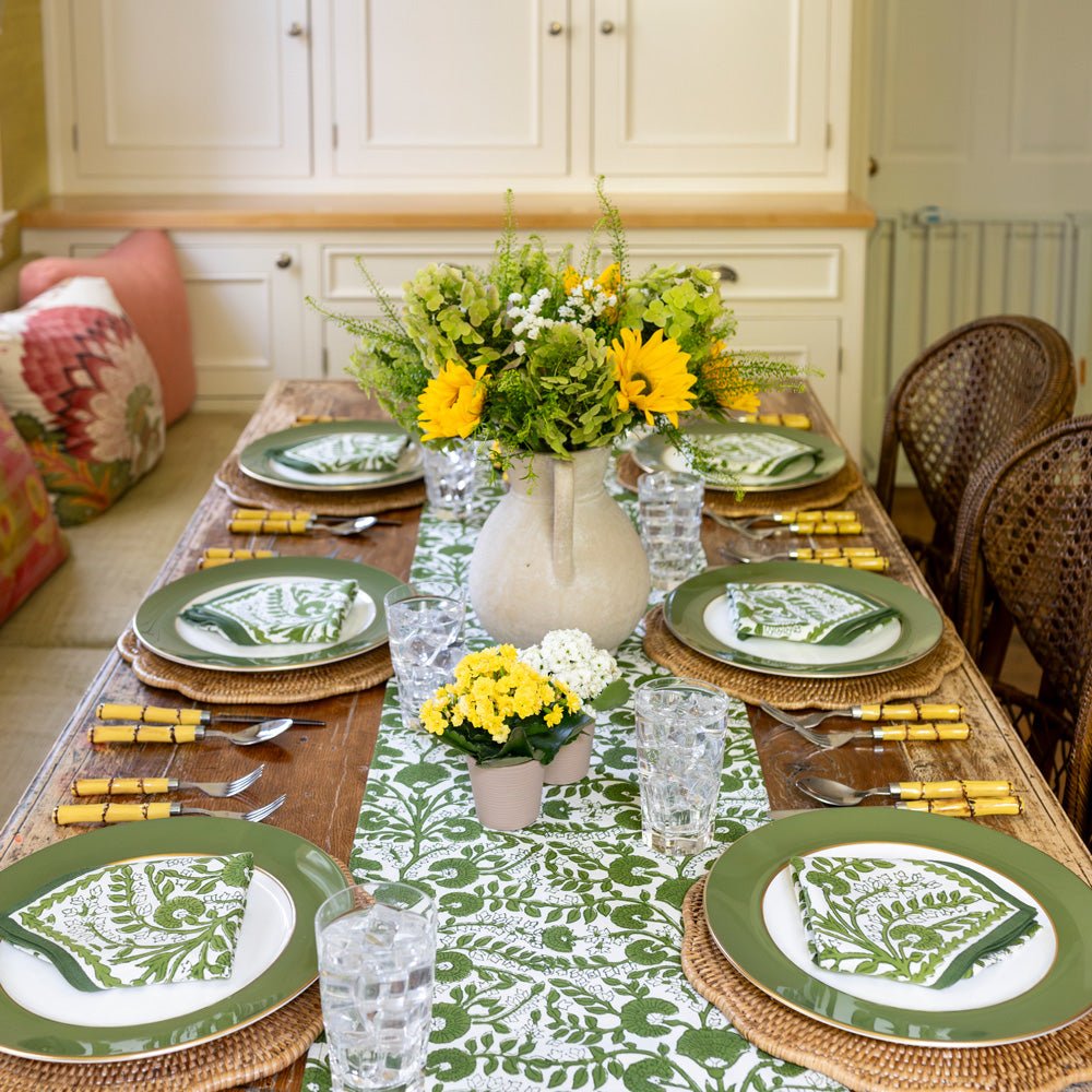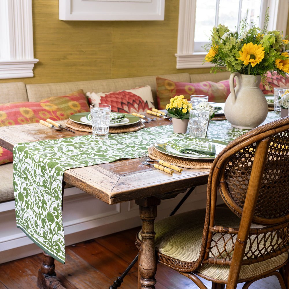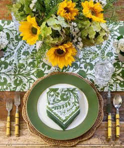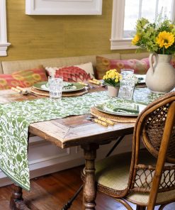 Add a touch of elegance to your dining table with the Cactus Flower Lettuce Green Table Runner. Hand block printed with a detailed floral pattern in a vibrant green, this table runner is perfect for bringing a fresh and inviting look to your table setting. Made from 100% cotton, it is both durable and easy to care for, making it a practical yet beautiful addition to your decor.