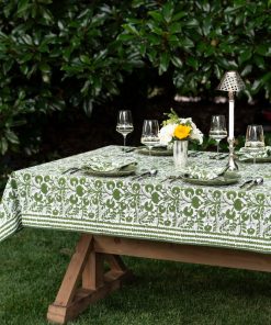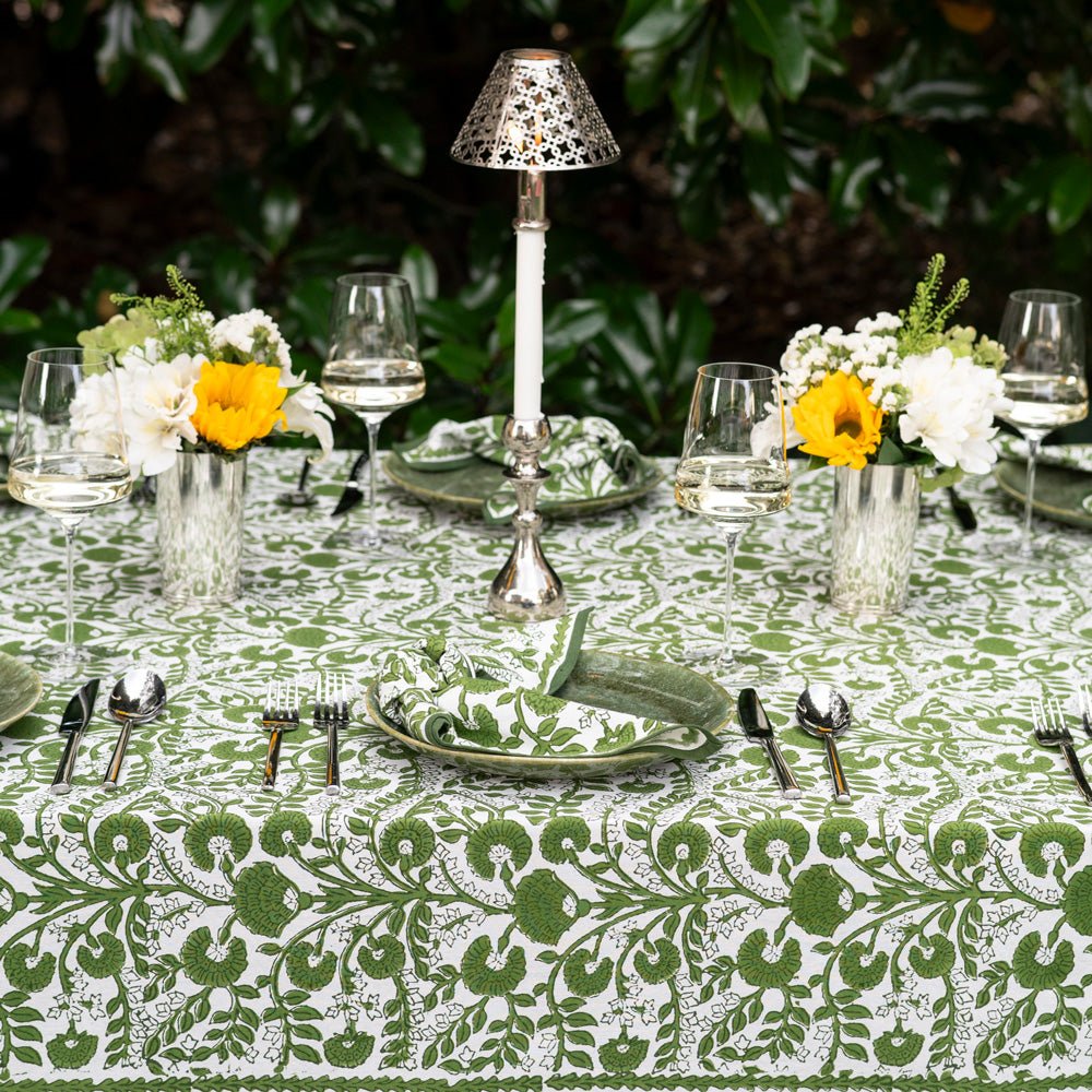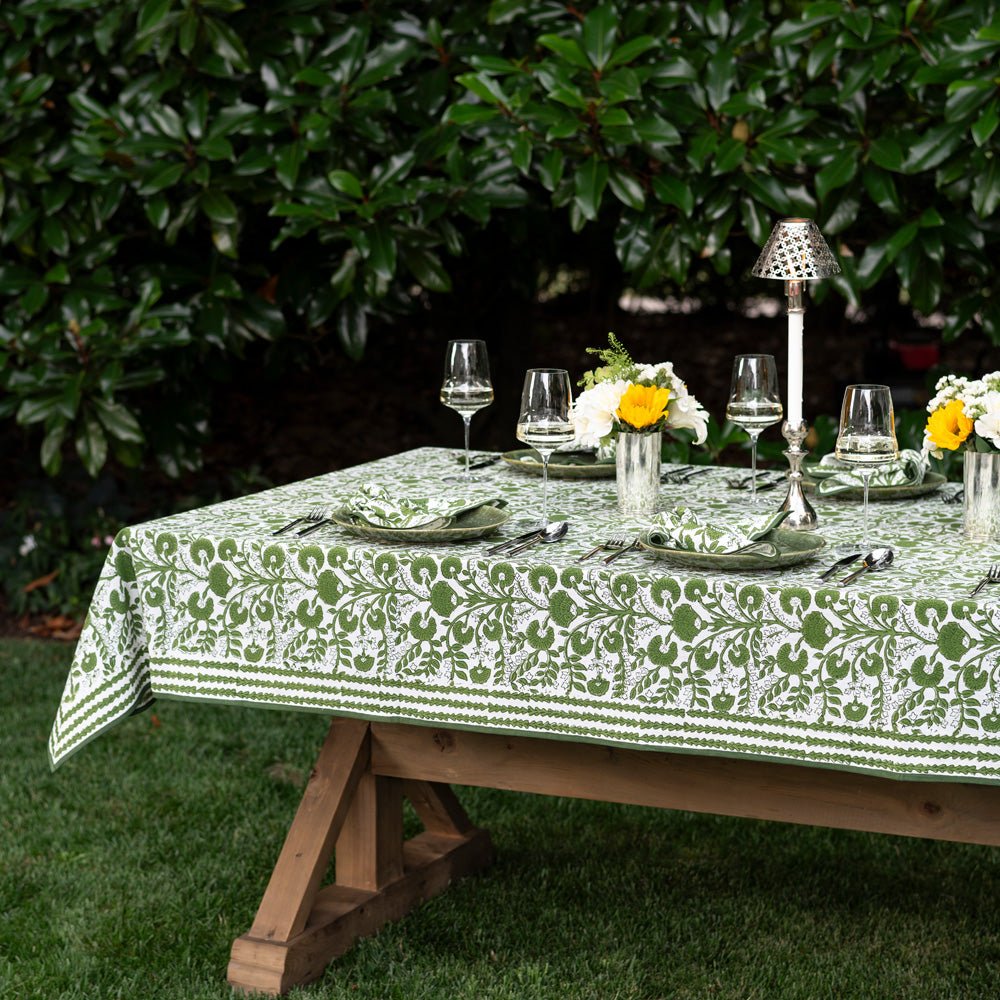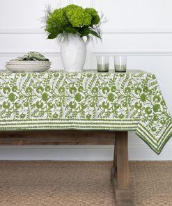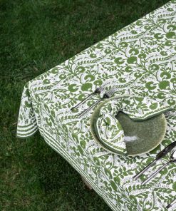 Create a stunning tablescape with the Cactus Flower Lettuce Green Tablecloth. Featuring an exquisite hand block printed design in lettuce green, this tablecloth is crafted from 100% cotton for a soft and durable finish. Its vibrant floral pattern will brighten up any dining area, making it ideal for both everyday meals and special gatherings.