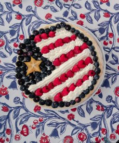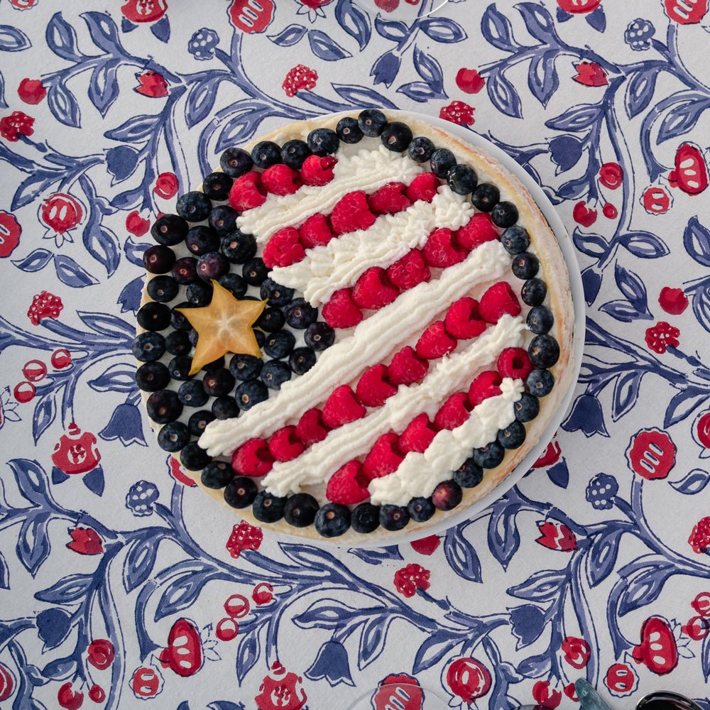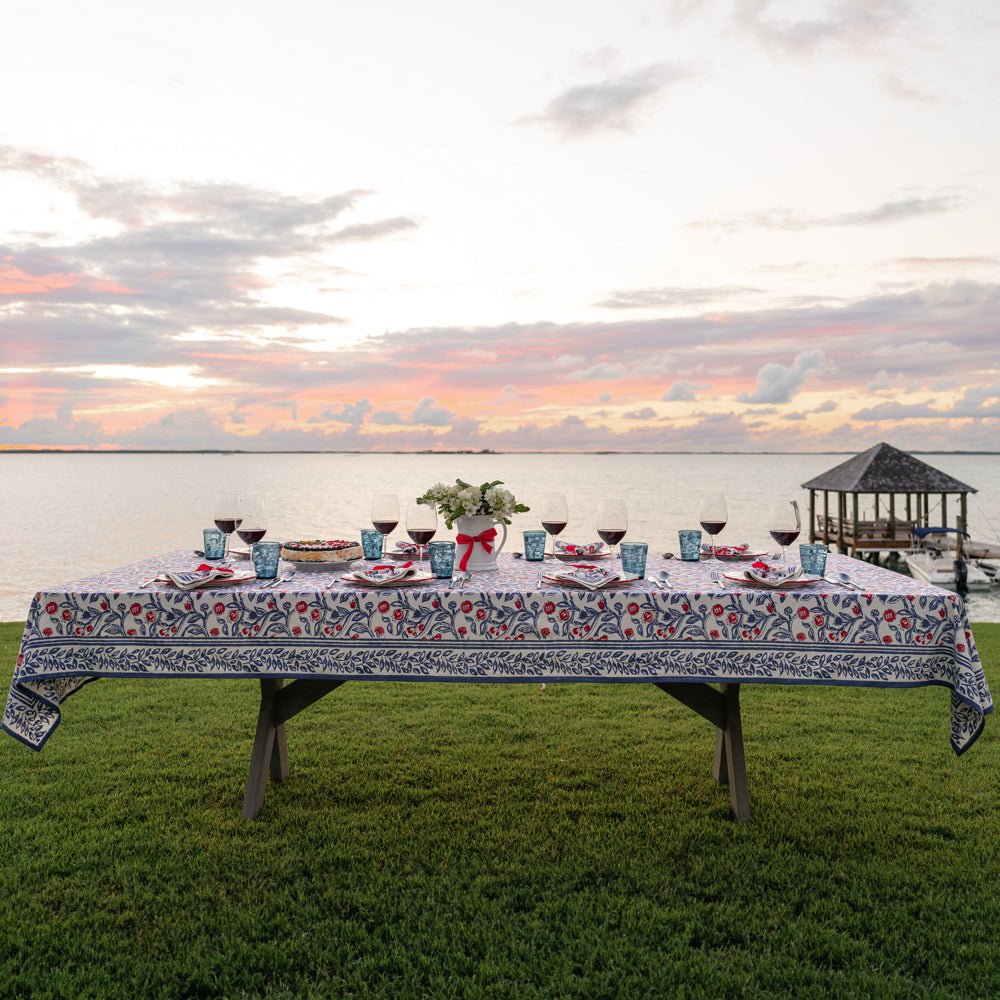 Our vintage Emma print has been going strong for over 25 years. This updated red, white and blue version is patriotic and all-American. Think Memorial Day and 4th of July, summer picnics and clam bakes. Pomegranate tablecloths are available in assorted sizes for all of your family gatherings, celebrations, around tables large and small, square, oblong and round.