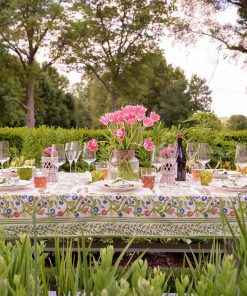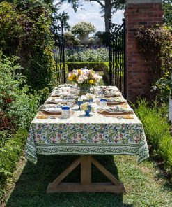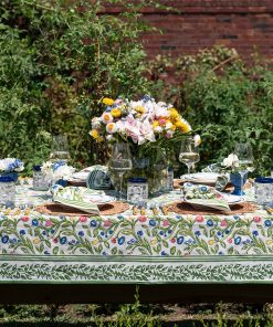 The essential Spring pattern! Hand painted flowers stretch across the vine in vibrant shades of yellow, blue, and red. Our Emma Tablecloth, a unique hand-blocked style that will give your dining table a fresh new look.