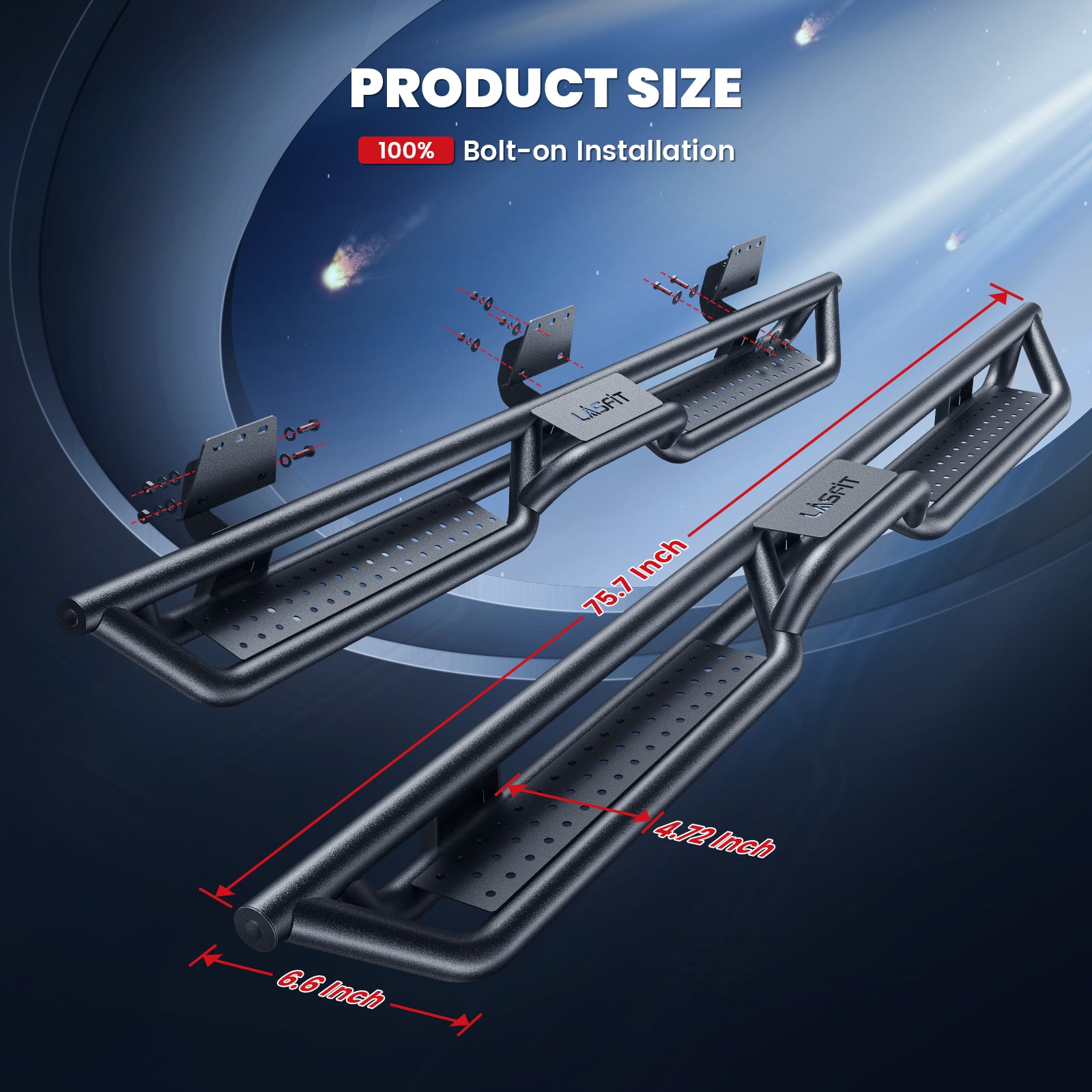 Engineered for strength and stability, these running boards feature three support tubes arranged in a reinforced triangular structure. A 0.55-inch steel connector bar links the upper and lower tubes, allowing the steps to support up to 600 lbs with confidence.