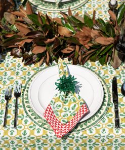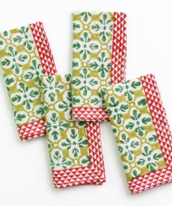 Add a splash of vibrant sophistication to your dining table with our Fleur de Lis Geo Saffron Napkins. This set of four napkins features a lively Fleur de Lis pattern in refreshing green tones, framed by a striking geometric border in bold red. Hand block printed on 100% cotton, these napkins are soft, durable, and perfect for adding a touch of artistic flair to your meals. Machine washable for easy care, they bring a modern twist to traditional design.