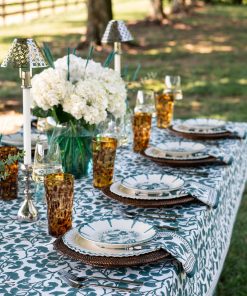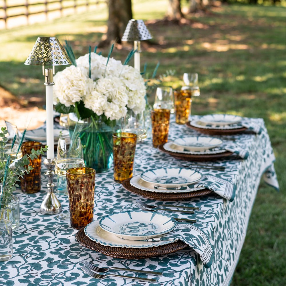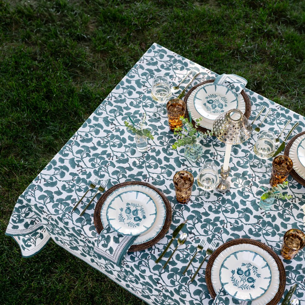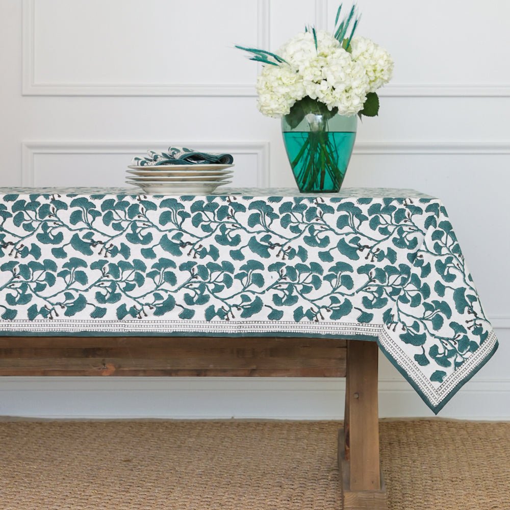 Transform your dining table with the artistic charm of our Ginkgo Teal Tablecloth. Hand block printed with elegant teal ginkgo leaves, this tablecloth adds a fresh, vibrant look to any meal setting. The bold, nature-inspired design brings a modern yet timeless appeal, perfect for entertaining or everyday use. Made from high-quality cotton, it’s durable, machine washable, and designed to maintain its beauty through countless gatherings.