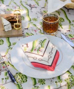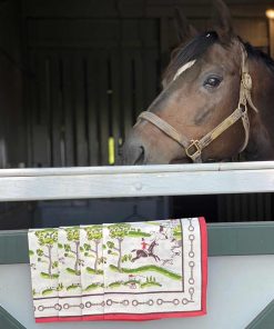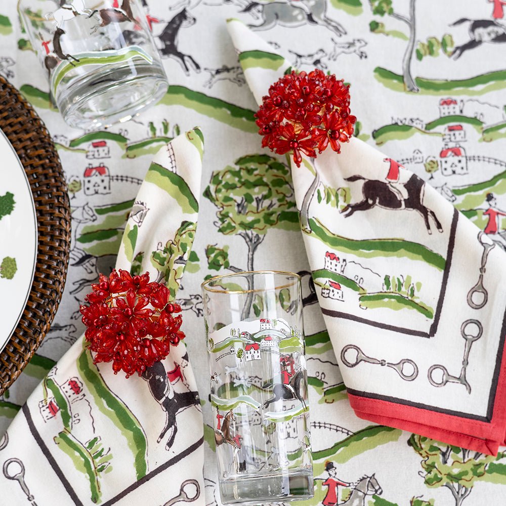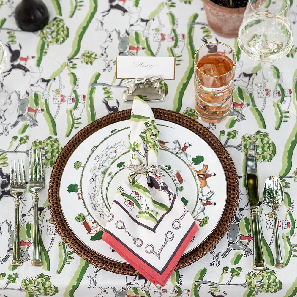Our exclusive hunt scene napkin adorned with a traditional historic scene that was inspired by historic equestrian prints. Regal gentlemen poised on the back of their majestic hunting horses, chasing the fox through the countryside dotted with red tiled cottages and their loyal pointer dogs leading the way. Lovely equestrian napkins to elevate your table. Sold in sets of 4.