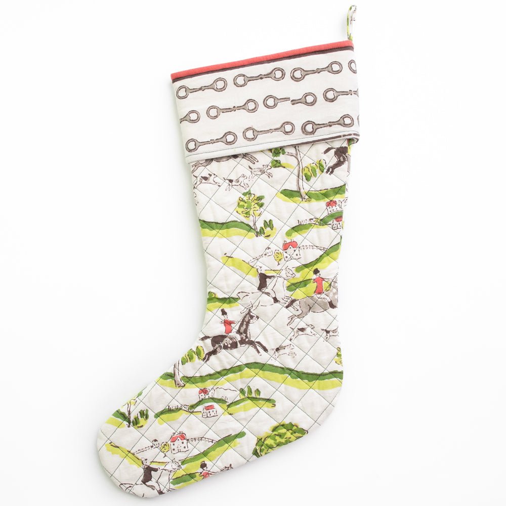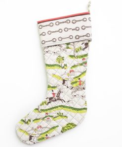 Add a playful and elegant touch to your holiday display with the Hunt Scene Quilted Stocking. This unique stocking features a whimsical depiction of a countryside hunt scene, complete with riders, hounds, and lush greenery, bringing a storybook charm to your décor. The quilted construction adds texture and warmth, while the brown equestrian-inspired cuff provides a sophisticated finishing touch. Made from high-quality cotton, this stocking is perfect for equestrian enthusiasts or anyone looking to add a distinctive touch to their holiday traditions.