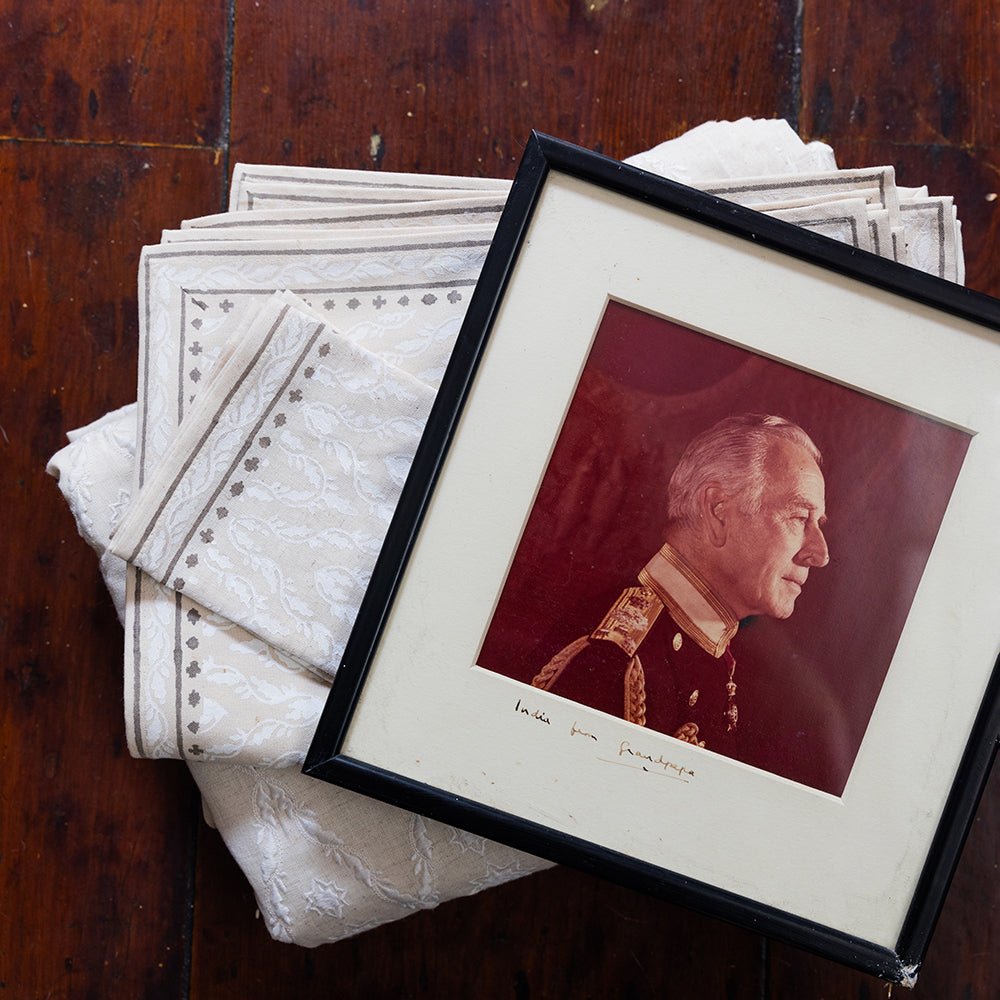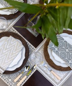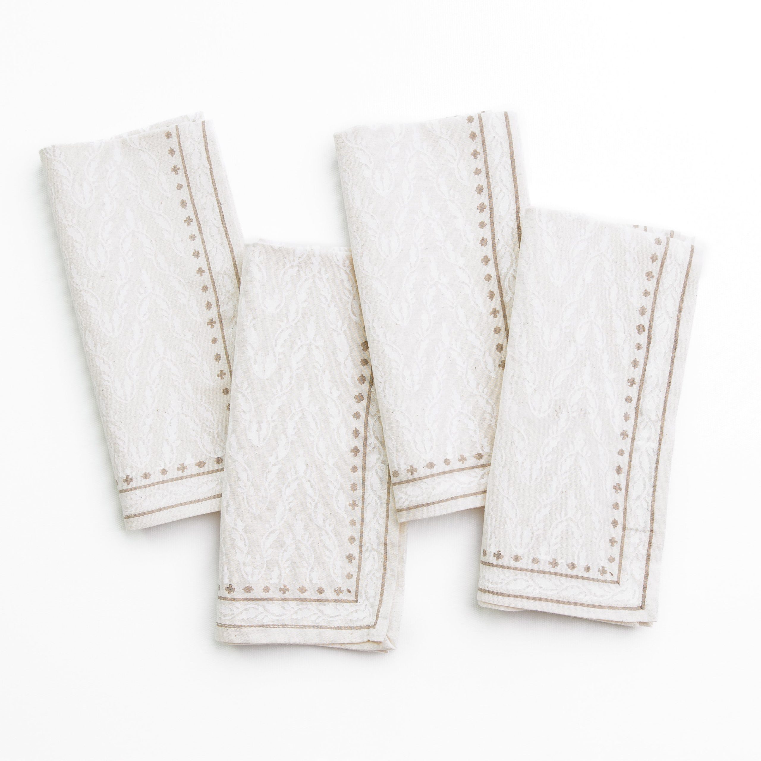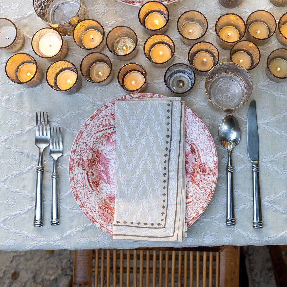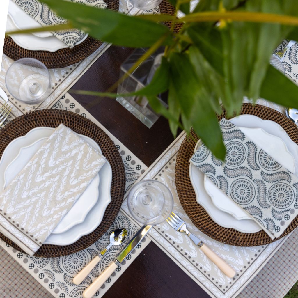 In the olden days, what we now see as the gold shoulder braid on high-ranking officers—called an aiguillette (pronounced “egg-wee-let”)—was originally just rope and pegs. It was carried on the shoulder by a knight’s aide-de-camp, ready to tether the knight’s horse. The ornamental braided cords with decorative metal tips are now worn on uniforms by officers to distinguish special and senior appointments, but wouldn’t it be fun if they were still used to tether the occasional horse? This hand block printed Chevron patterned napkin set draws its inspiration from those striking gold braids. It’s a modern take on tradition, perfect for bringing a bit of timeless style to any setting.