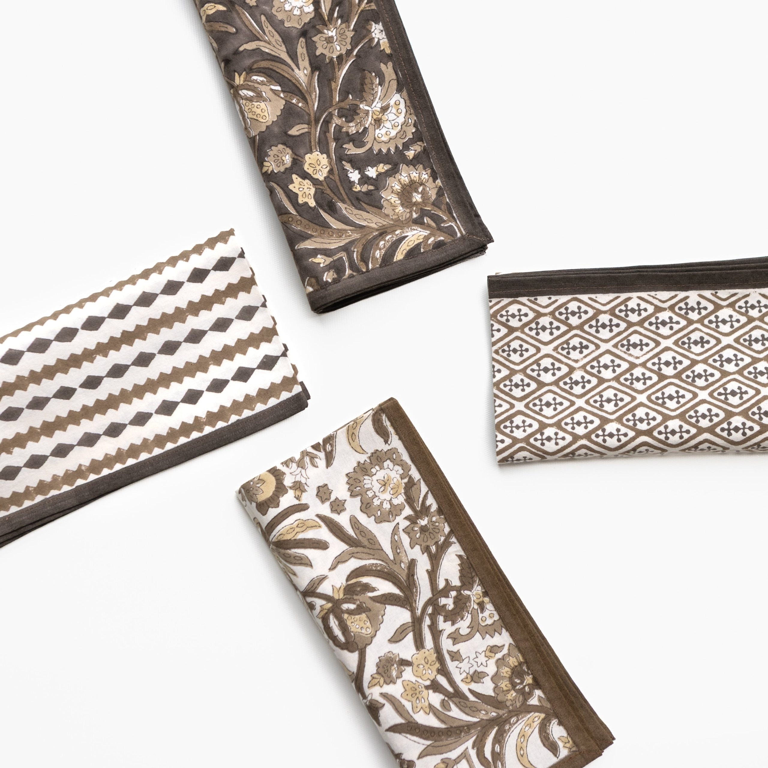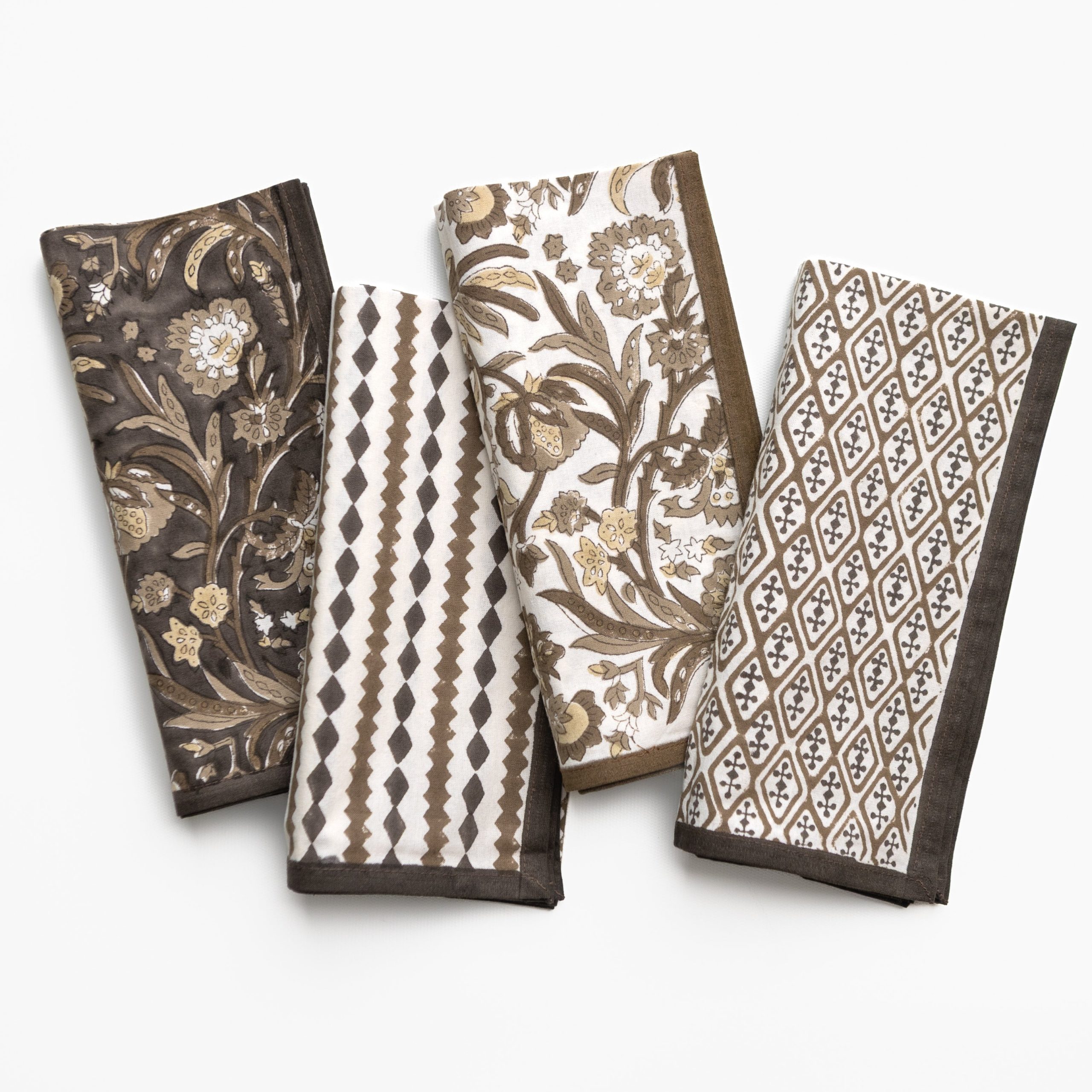 This mixed set of four napkins deals out a winning combination of mocha and chocolate tones. Each motif brings contrast and charm, making them perfect for layering into any tablescape. Designed to mix seamlessly, they offer both variety and cohesion in one set. Whether casual or celebratory, they’re a hand you’ll reach for often.