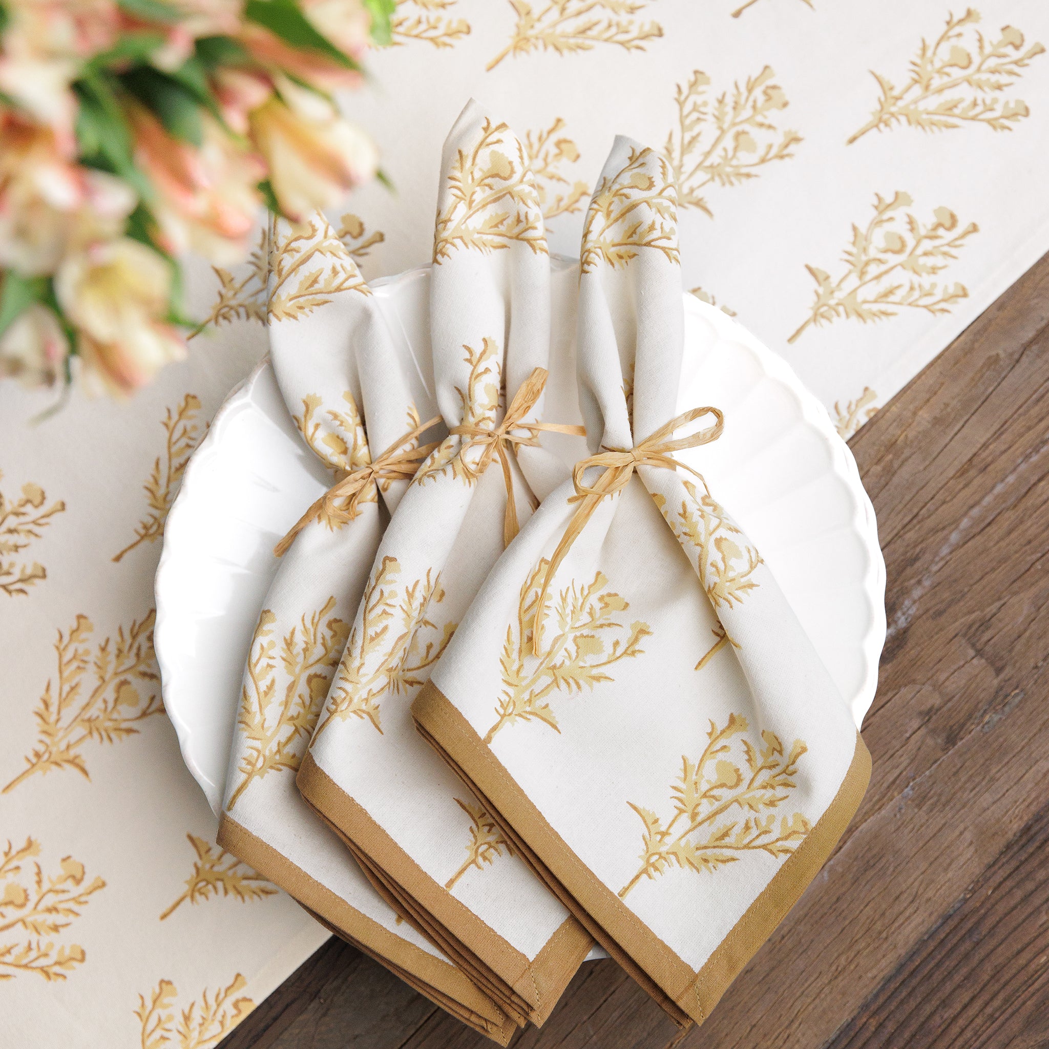 The thistle, admired for its strength, protection and resilience is hand block printed on 100% cotton napkins in sandy neutral tones. Inspired by the structured beauty of David Hicks’ English garden and the slight surprise of finding a wildflower beautifully woven into the structured space. Crafted from soft, durable cotton, these cloth napkins are a timeless addition to any dining setting—season after season.
