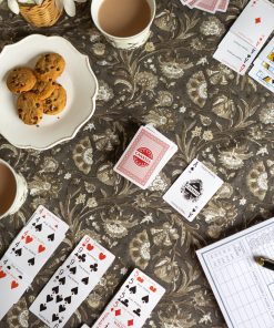 This tablecloth transforms your table into a bold backdrop of card motifs and board patterns in rich chocolate. The all-over print sets the stage for gatherings that balance fun with style, making every meal feel like a winning round. Crafted to layer with ease, it pairs beautifully with simple dinnerware or vibrant accents. Elevate game night or everyday dining with this dramatic design.