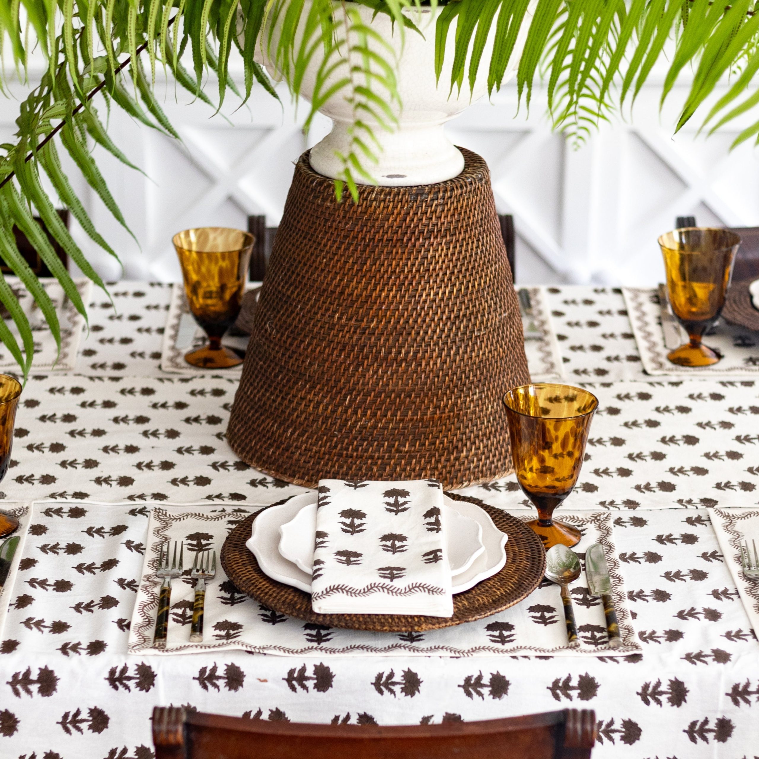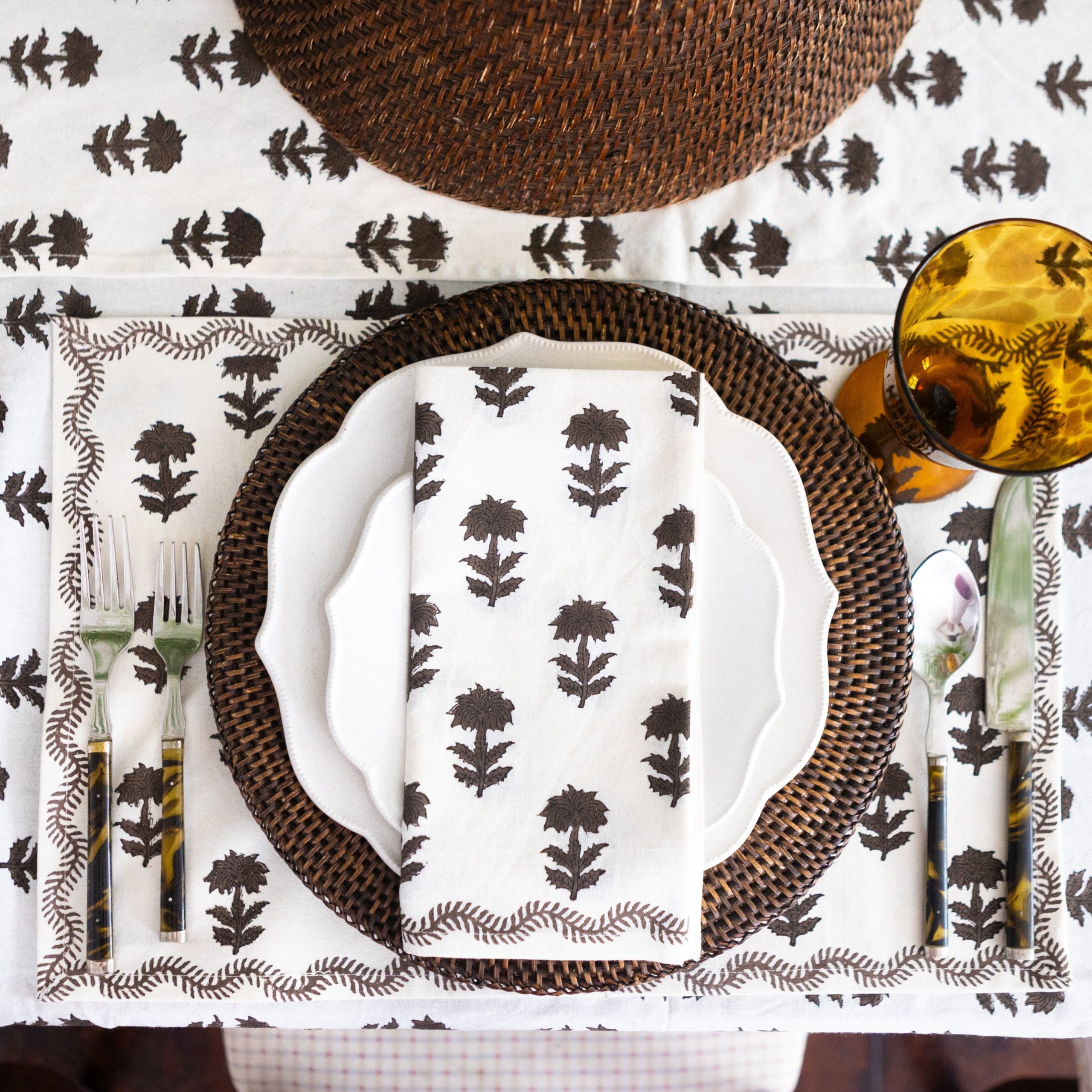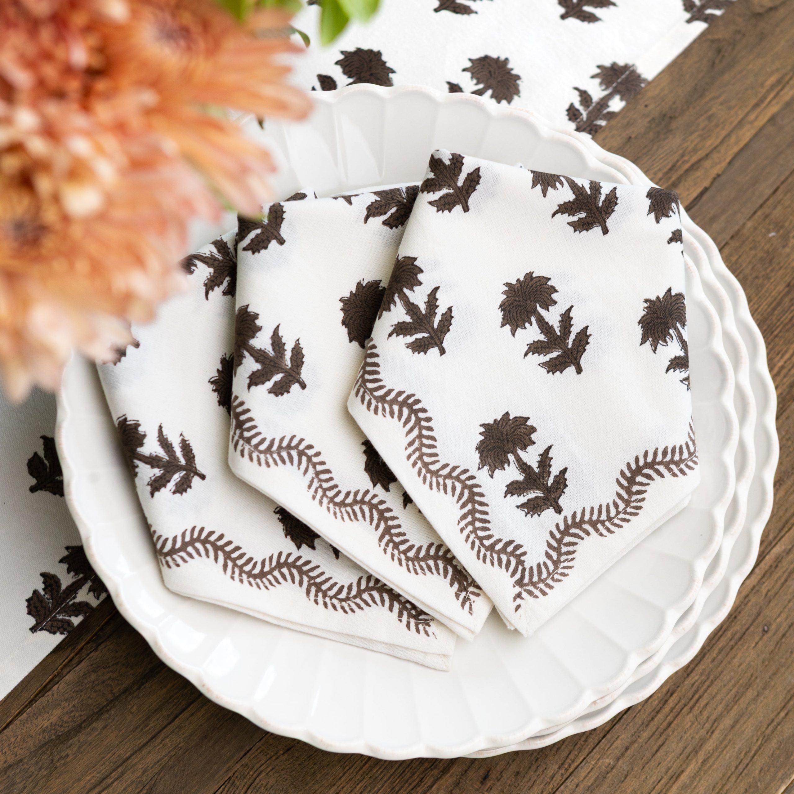 The Winter Flower Chocolate Napkins balance structure and natural flow, echoing the elegance of a well-tended garden. Chocolate-toned blooms, inspired by winter skies and garden arches, are hand block printed on soft 100% cotton. Perfect for elevating everyday meals and layering with the matching tablecloth, these napkins bring warmth and texture to any table.
