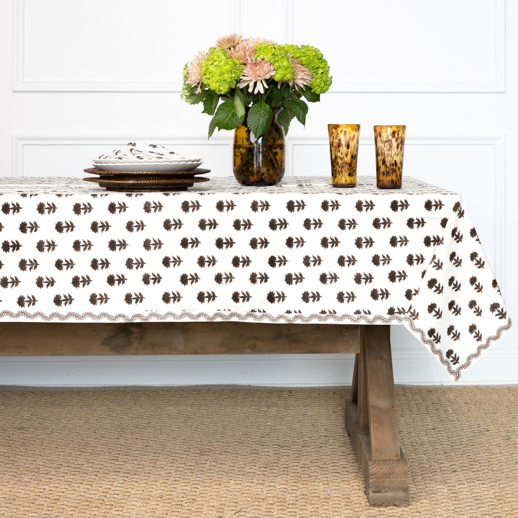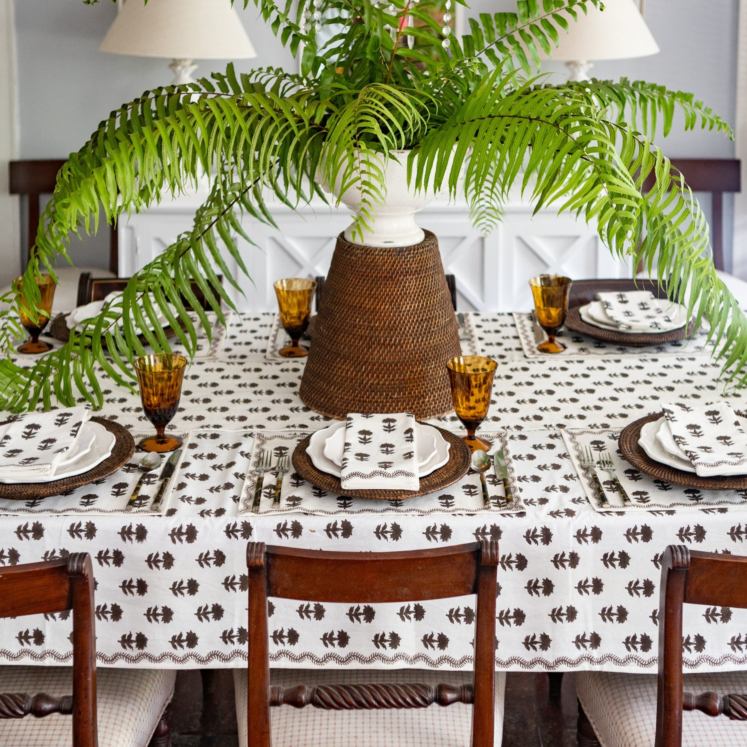 Chocolate hued blooms scatter across a cream ground, a quiet nod to winter skies glimpsed through hornbeam arches. David Hicks believes a garden should stand strong even in winter, and the Winter Flower Chocolate tablecloth reflects that philosophy. Crafted from 100% cotton, this elegant tablecloth adds warmth and timeless style to any dining table.
