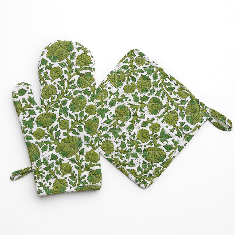 Cooking feels more fun when your kitchen is dressed properly. The Jade Blossom Oven Mitt Set features hand-block printed florals in fresh green hues, adding a playful pop of pattern to your daily routine.