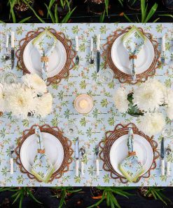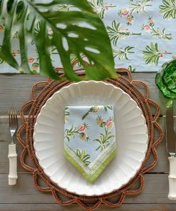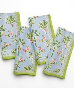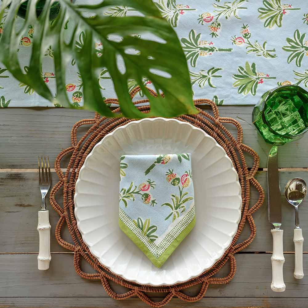 Tropical island palms and pineapples adorn this coastal themed light blue and green Pomegranate hand block printed cotton napkin. Complement your breakfast, lunch and dinner table with these refreshing and original table linens.