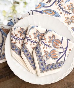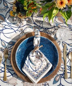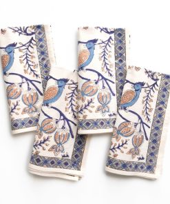 Complete your table with our Peacock & Poms Napkins in blue. These hand block printed cotton napkins feature peacocks and pomegranates in rich indigo tones. Artful yet functional, they layer beautifully with neutral or patterned dinnerware.