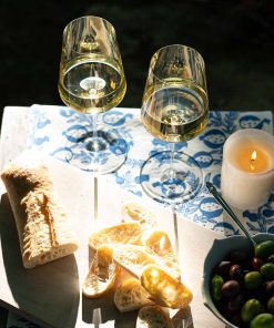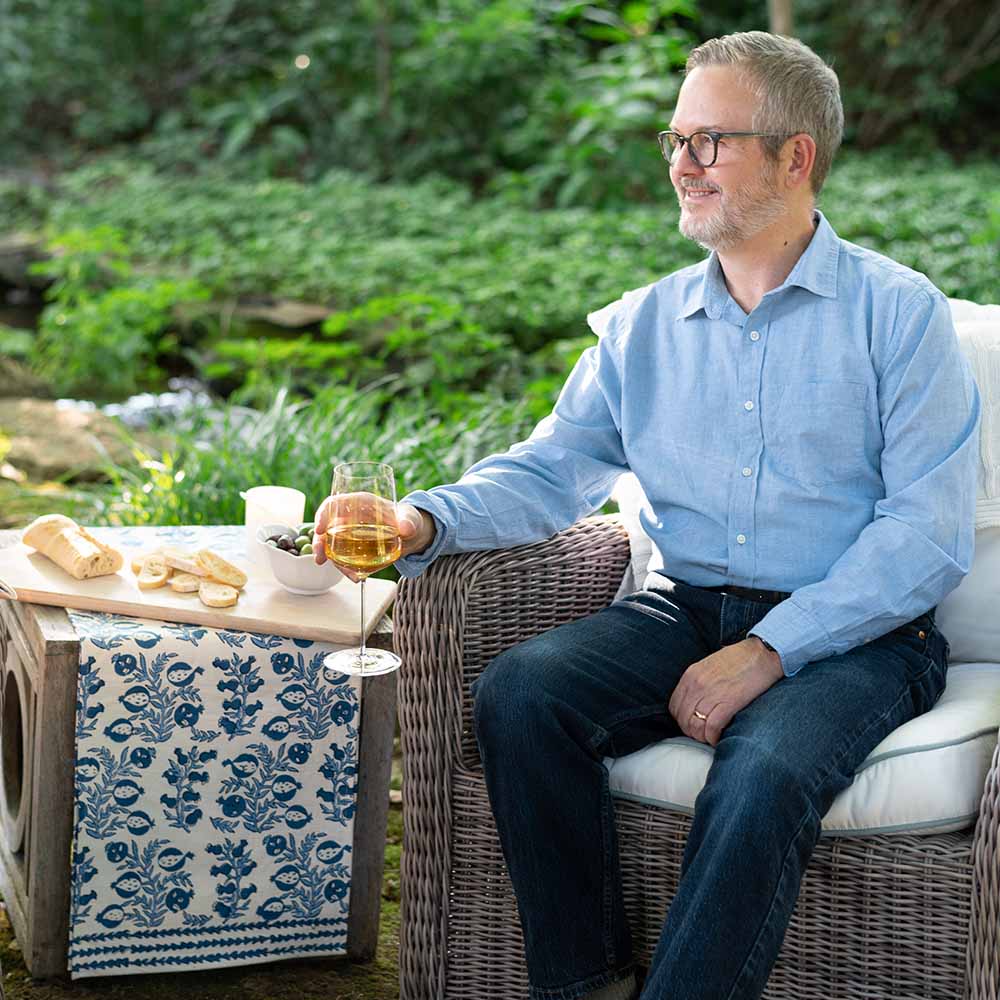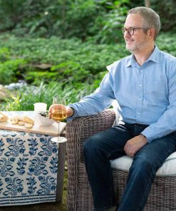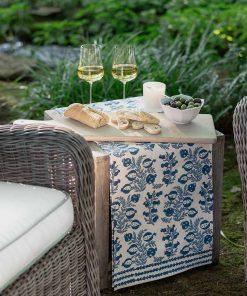 The sweet shape of young pomegranates inspired this print, which features the fruit in both its baby and mature stages. Lively branches with pale blue leaves end with plump pomegranates in more shades of blue. This table runner pairs beautifully with Natural Bamboo Cane Placemats and Melograno Wedgewood napkins.