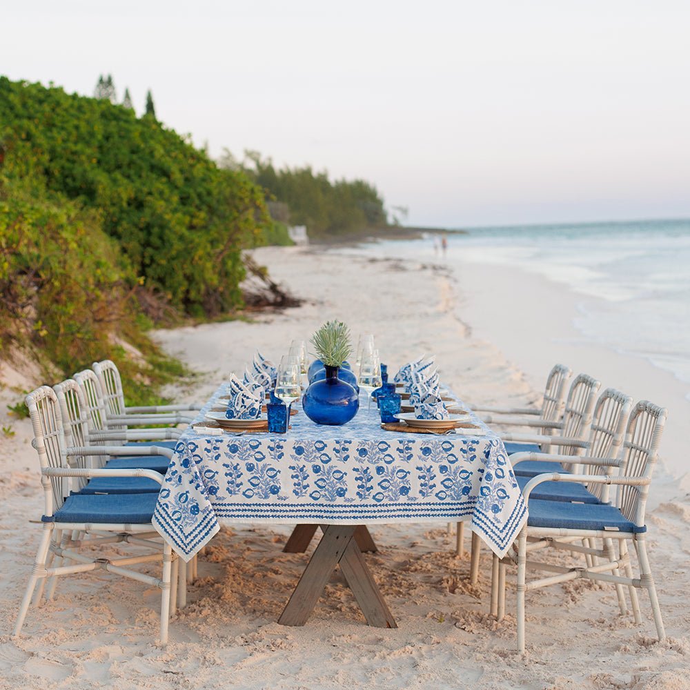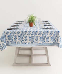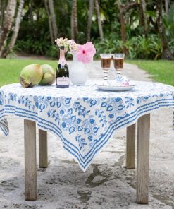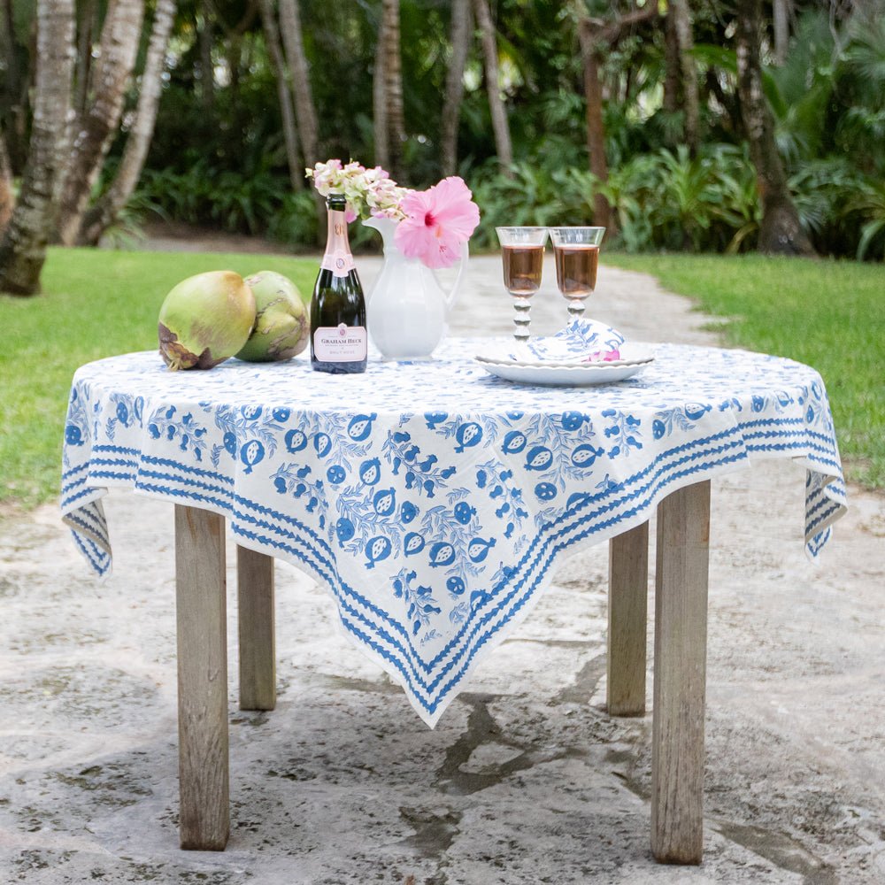 The sweet shape of young pomegranates inspired this print, which features the fruit in both its baby and mature stages. Lively branches with pale blue leaves end with plump pomegranates in varying shades of blue. This tablecloth pairs beautifully with the Pom Bells Wedgewood napkins and runner. Add our Natural Bamboo Cane Placemats for additional style.
