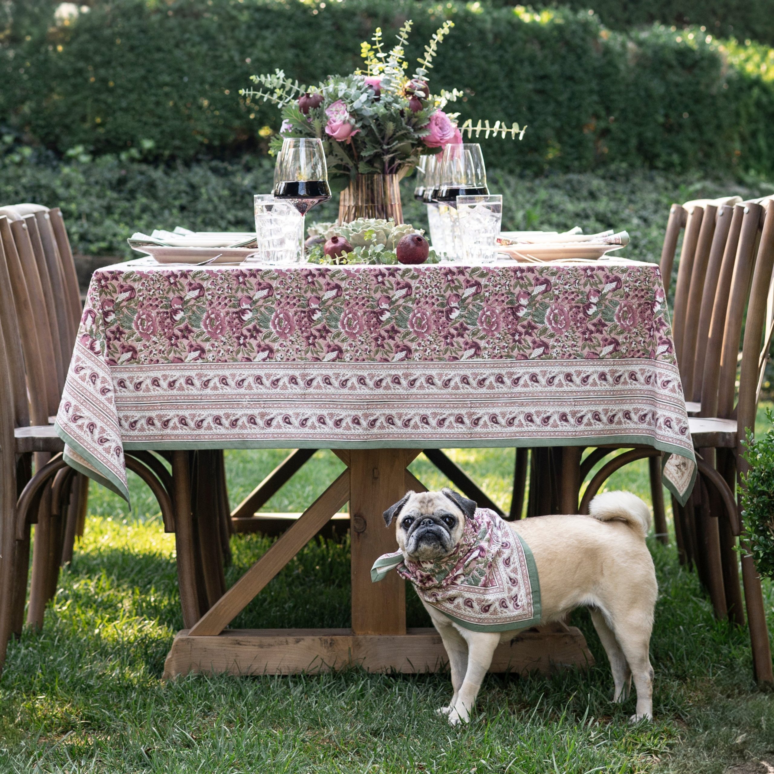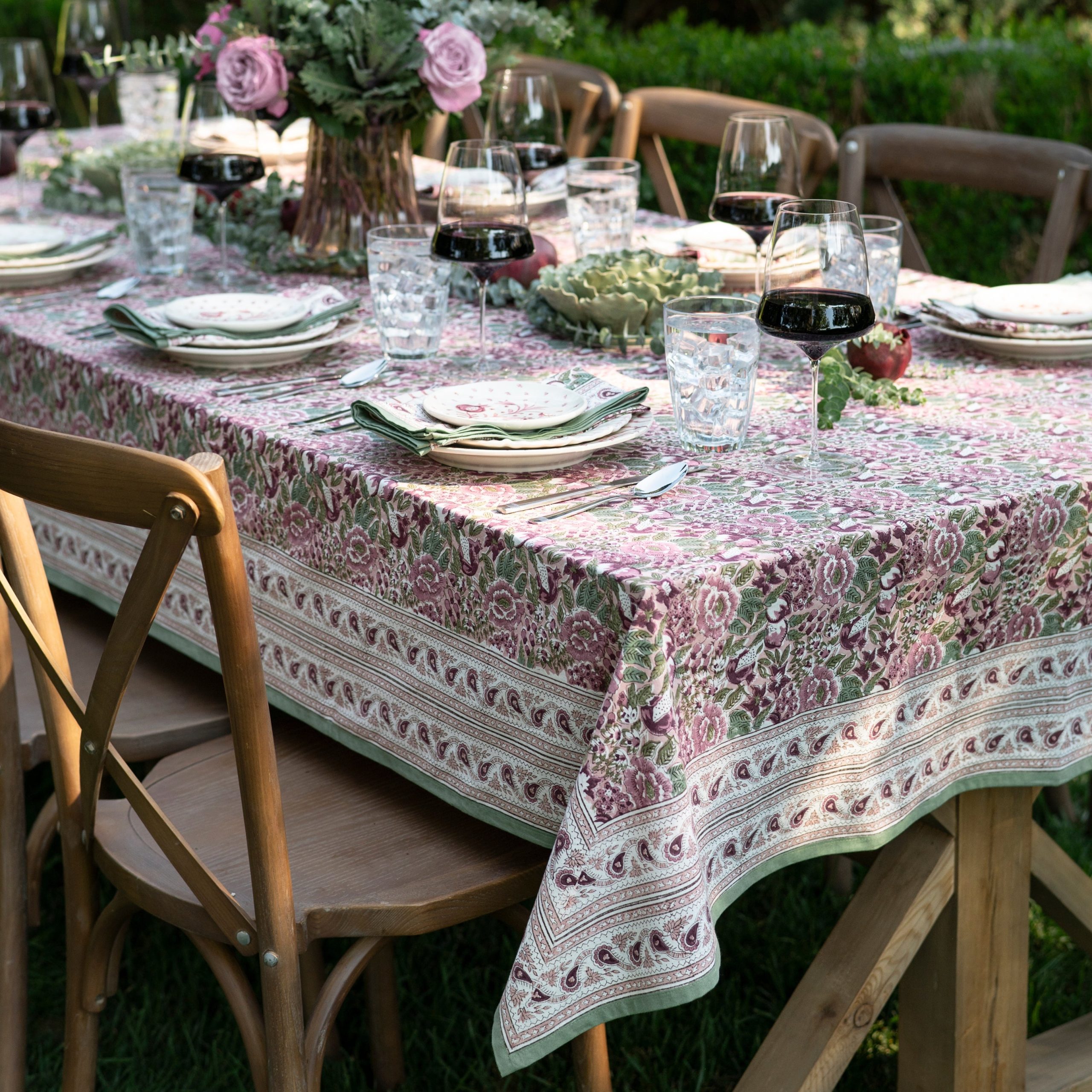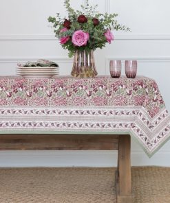 Bring timeless charm to your table with our hand block printed cotton tablecloth, featuring a soft floral pattern in shades of green, pink, and burgundy. Delicately designed to balance elegance and versatility, this tablecloth adds warmth and color to any dining space. Perfect for casual family meals or special gatherings, it layers beautifully with coordinating napkins and placemats for a complete tablescape. Crafted from 100% cotton, this durable and easy-care tablecloth makes entertaining both effortless and stylish.