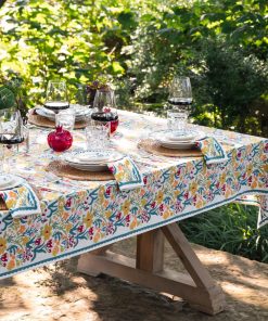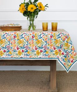 Invite the beauty of a blooming garden into your home with the Teal Garden Tablecloth. This hand block printed tablecloth features a colorful floral pattern in shades of teal, yellow, pink, and green. Whether for a family dinner or an outdoor picnic, this 100% cotton tablecloth creates an inviting, cheerful ambiance while being easy to care for. Its vibrant design and sturdy fabric make it a timeless addition to any dining experience.