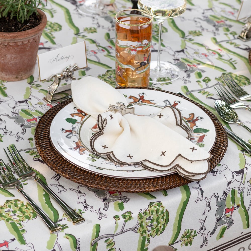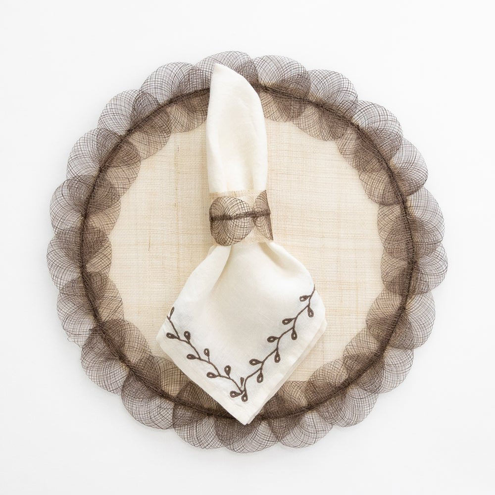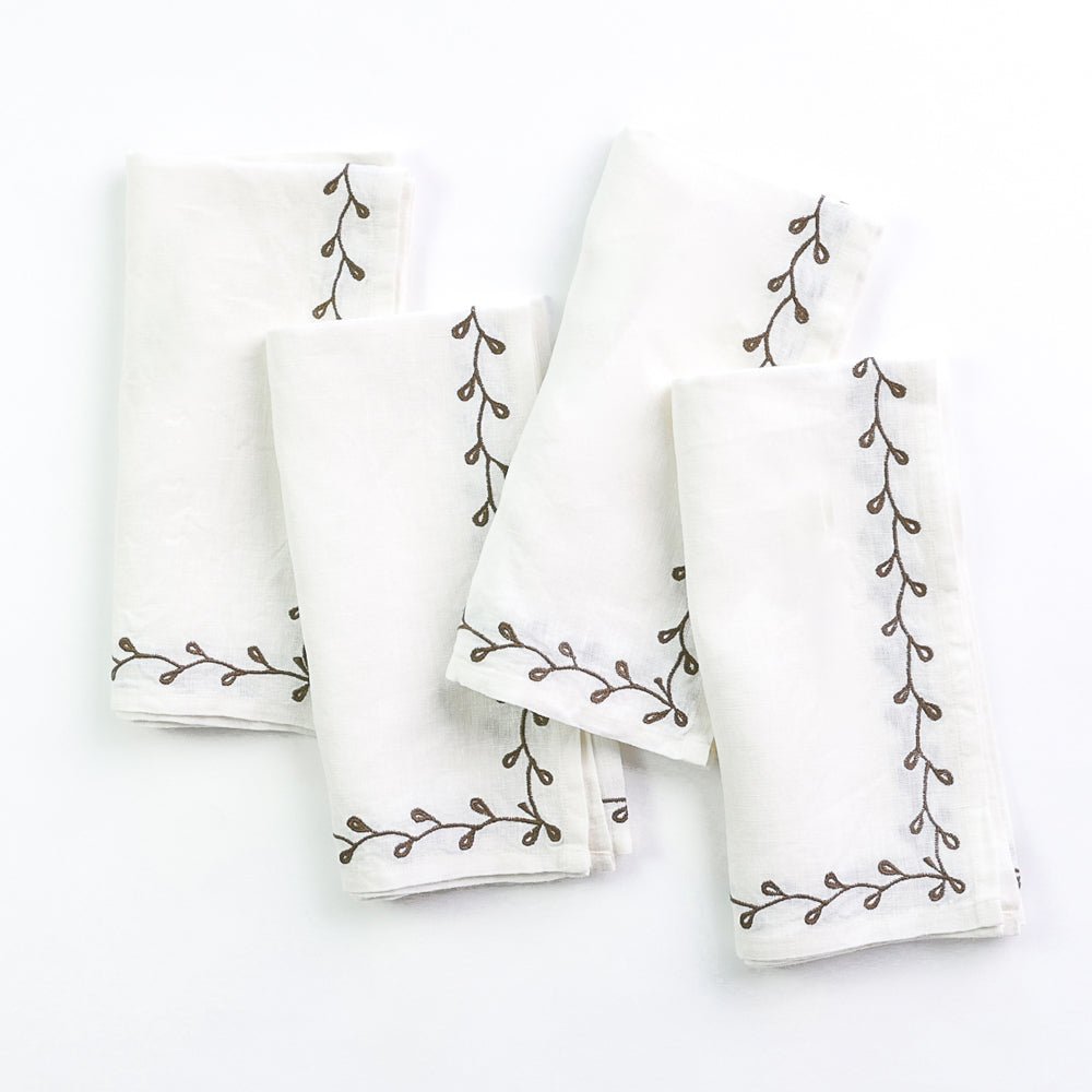 Upgrade your table setting with our Twig & Bud Brown Embroidered Linen Napkin Set. Made of high-quality white linen, each napkin showcases a delicate brown twig & bud border, adding a touch of elegance to any meal. Includes 4 napkins in a set.