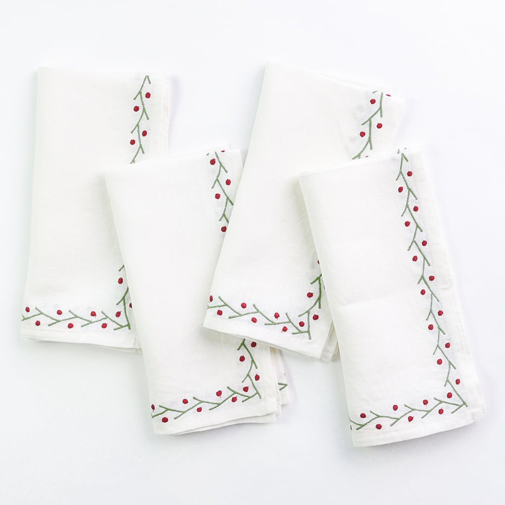 Experience the elegance and charm of these white linen napkins, accented with a stunning red and green embroidered twig & dot pattern. Perfect for any occasion, this set of 4 napkins adds a touch of sophistication to your table setting.