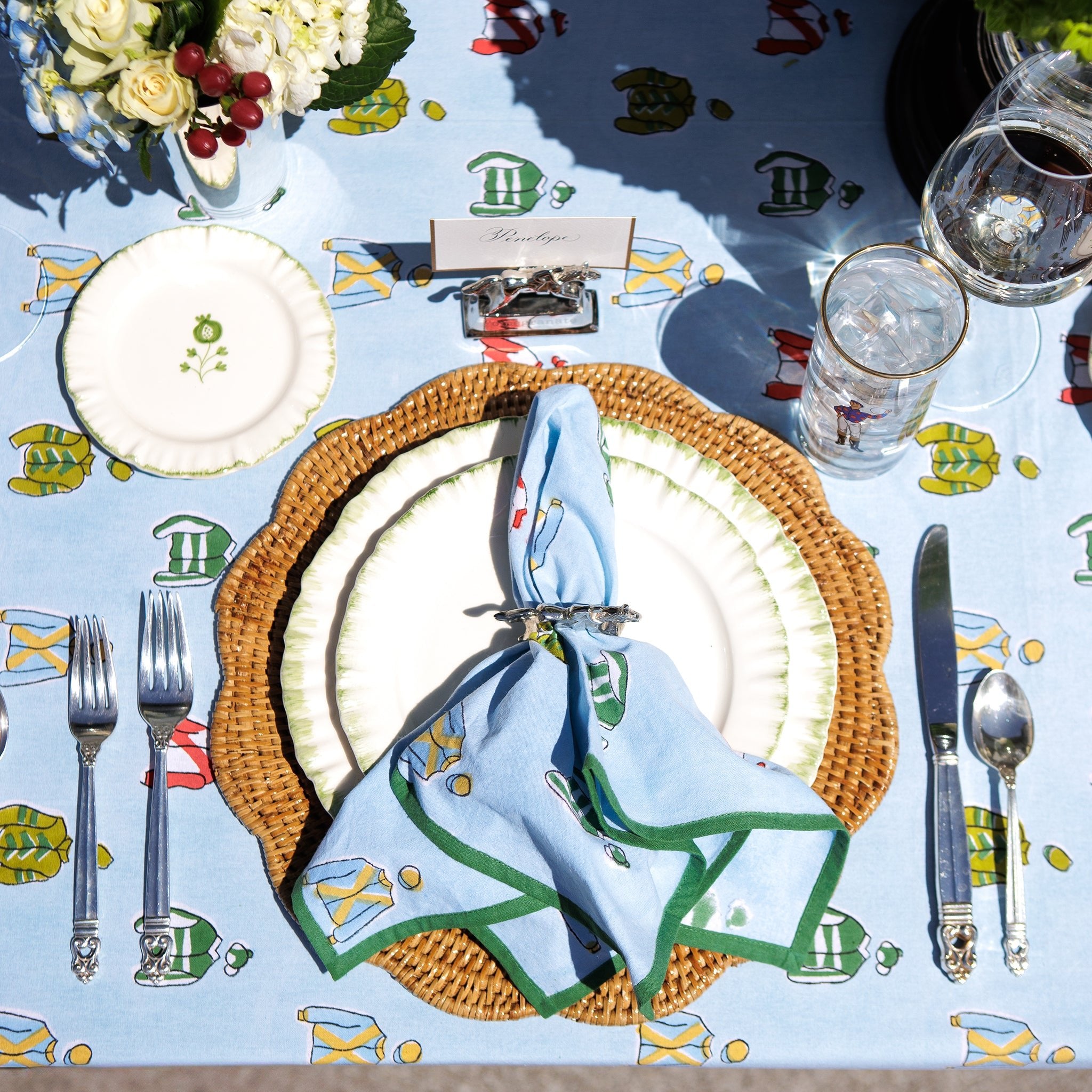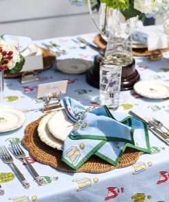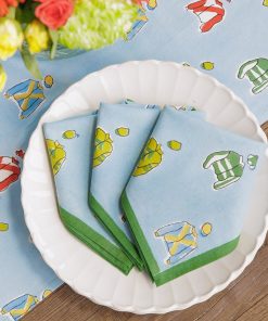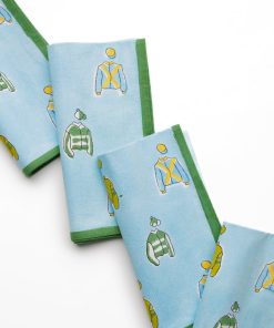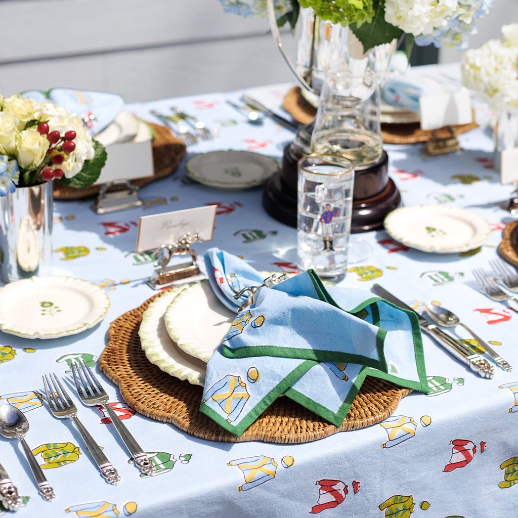 Every winning table needs the right finishing touch, and these Vintage Jockey Napkins are the perfect way to add a bit of Derby Day fun to your spread. Sold in a set of four, each napkin features a hand-block printed pattern of colorful jockey silks on a sky-blue background with a crisp green trim. Made from 100% cotton, these napkins are soft, durable, and machine washable—so you can focus on placing your bets, not worrying about spills!