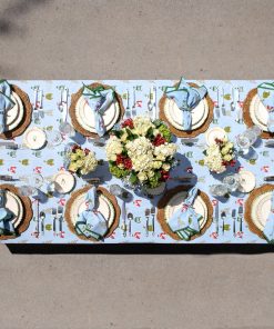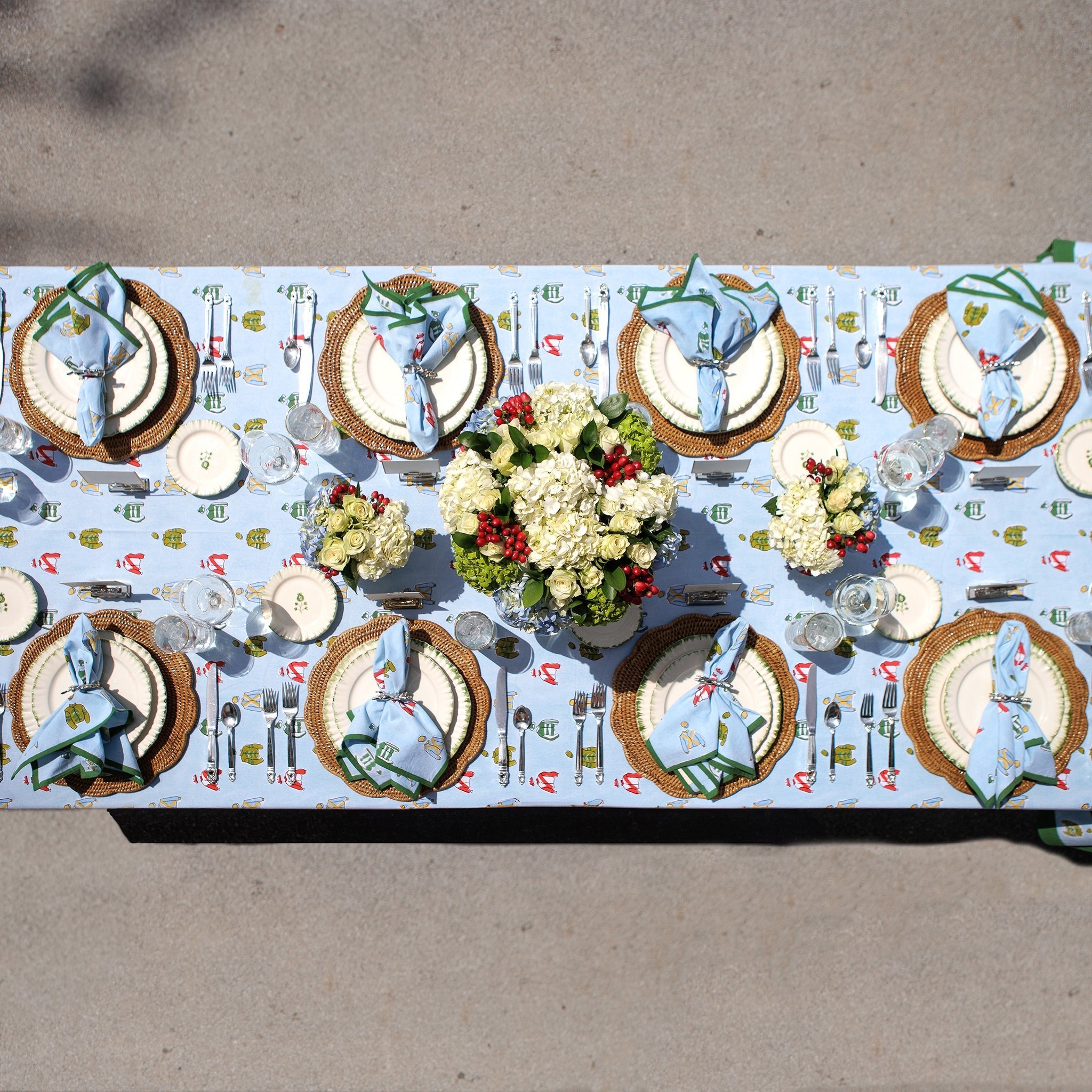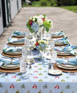The race to a beautifully set table just got easier with our Vintage Jockey Tablecloth! A lively mix of brightly colored jockey silks dance across the light blue fabric, bringing a sense of fun and excitement to your meals. The crisp green border ties the design together, creating a look that’s perfect for Derby Day parties, brunches, and beyond. This tablecloth is your winning ticket to a stylish setup.